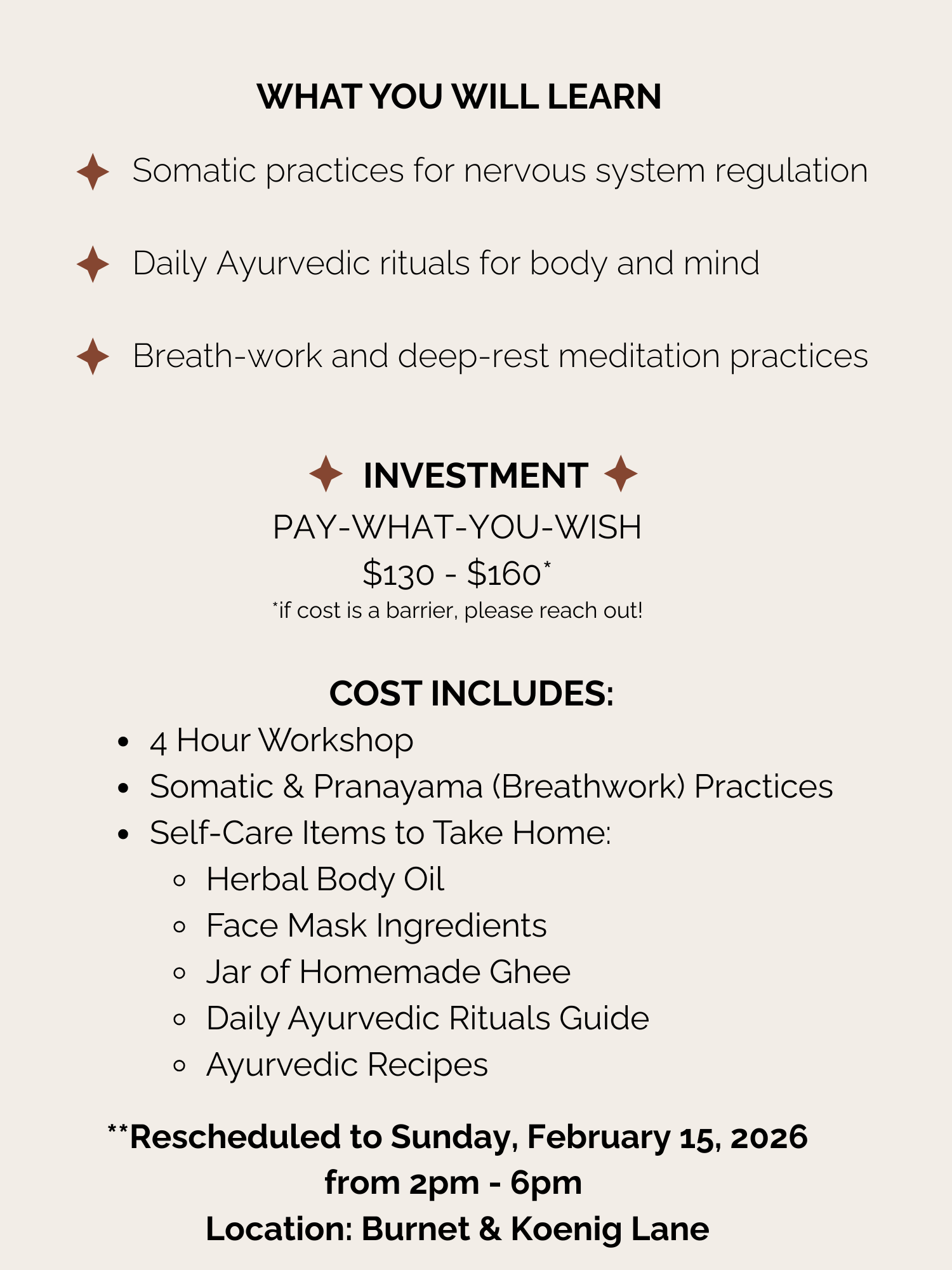 A 4-hour immersive workshop blending somatic practices and Ayurvedic self-care rituals. We’ll move, release and reset the nervous system through embodied practices, nurture the body with abhyanga (oil massage) and herbal teas, reflect through journaling and group shares and meditate through yoga nidra. You’ll leave grounded, glowy, and reconnected to yourself.